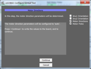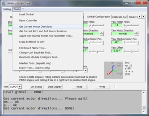 [GUI:Get Current Motor Directions]: Since the gimbal is now in a normal operation, the AUTODIR phase was completed, it knows the directions. By selecting this menu the motor directions in the [GUI:Gimbal Configuration] tab are changed from "auto" to their actual direction "normal" or "reverse".