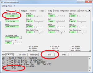 Gimbal starts shaking, makes high frequency noises and things like that: This would be normal as we have not yet tuned the PID values for the motor control loop. In case that happens, set for all motors the P, I and D values to very low numbers but not zero (P=0.10; I=5.0; D=0.0050) and write them to the board. This will cause the gimbal to be slow when correcting movements but at least you can prove all is functional.