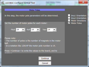Change to the [GUI:Gimbal Configuration] tab. There you can enter the values for the motor poles, the motor directions and the IMU orientation manually, or run the [GUI:Configure Gimbal Tool].