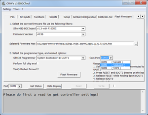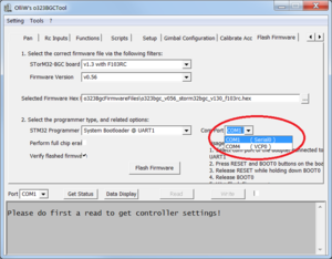 Then plug in the STorM32 board via the USB cable to power it. Either the matching driver was installed already or it will be installed now. Either way, once windows has installed the driver when clicking on the drop down for the COM port selector, it should now show an additional one.