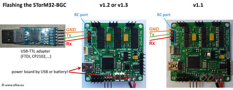 The STorM32-BGC board can be obtained from various shops. There are several hardware revisions around, but, frankly, they do not differ much. There is, e.g., nothing wrong with buying a v1.1 board, just keep in mind that some pins are placed differently here. A v1.3 board is used exemplary below.