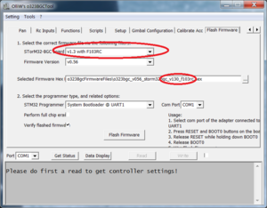 Comment: Since v0.57e a new [GUI:Configure Gimbal Tool] is implemented, which further simplifies setup enormously (see Quick Start Guide). The first steps are however essentially identical to those described here.