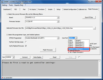 9. Now select the COM port of the USB-TTL adapter (not the STorM32 board, but the USB-TTL adapter). This is done with the [Com Port] selector in the middle of the screen, not with the [Port] selector in the bottom left! Click on the drop down box to see all currently available COM ports. Since we have not yet connected the USB-TTL adapter to the computer, the new COM port which appears when plugging in the USB-TTL adapter will be the one to use. Hence remember that list of ports to identify the new one in the next step.