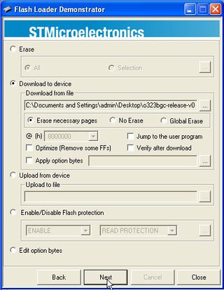 3. Start the Flash Loader Demonstrator, choose the correct COM port and then press the Boot0 and Reset buttons on the controller as described in step 10 under Flashing Firmware using a USB-TTL Adapter. Click next.