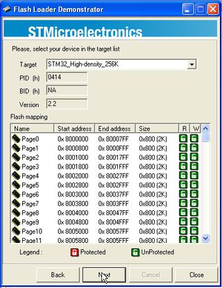 1. Follow steps 1-3 of Flashing Procedure for Win XP for downloading, installing and starting the Flash Loader Demonstrator of STMicroelectronics.