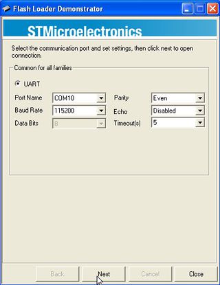 Comment: The USB-TTL adapter needs to be connected to the PC before the Flash Loader Demonstrator is started.