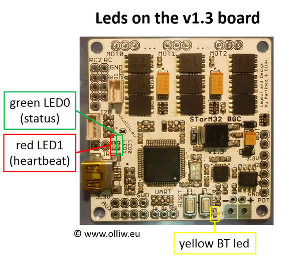 The STorM32 boards have two LEDs, a green LED named LED0 and a red LED named LED1, which provide info about the controller's current condition. On the v1.x boards there is also a third yellow LED, which however is related to the HC06 Bluetooth module which can be installed on these board versions.