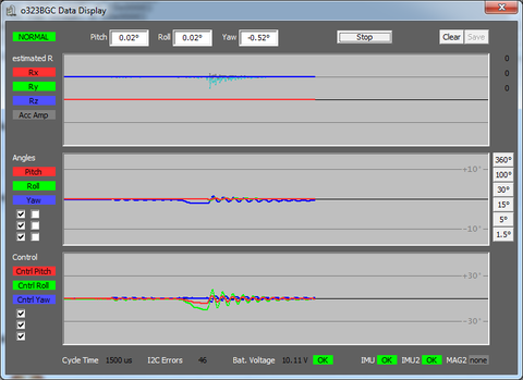 In order to ensure a correct IMU orientation you should test it. Write the setting to the controller (temporarily or into the EEPROM) and then click on the [GUI:Data Display] button. This opens a realtime monitor window. In the top you can see the current Pitch, Roll, and Yaw angles once you did click on [GUI:Start] in the window.