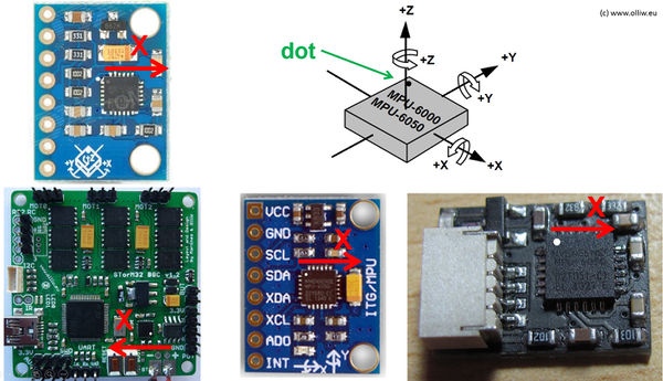 In case your IMU board has no arrow printed on it or you are uncertain, when you can also use the white dot in one of the corners on the IMU chip (MPU6050) to determine the orientation. In the diagram below the axes and their orientation in relationship to the dot are shown as sketch and for some examples.