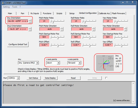 Selecting the fields [GUI:z axis points] and [GUI:x axis points] determines the IMU orientation index, here no. 15, and writes it into the Imu Orientation parameter field located in the left top corner in the [GUI:Gimbal Configuration] tab.