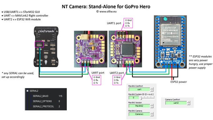 The Wifi module (loaded with the Arduino sketch) is connected via its serial port to the NT Camera module, i.e. the EXT-3 and EXT-2 pins on your NT Imu module (see NT Camera Support by NT Imu Modules). Alternatively, the Wifi module can be connected to the UART or UART2 port on the main STorM32 controller, which often can be the more convenient setup, as it much simplifies wiring.