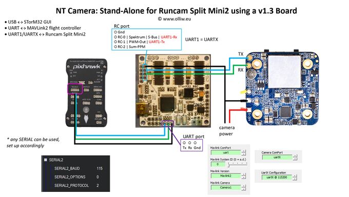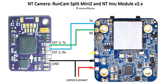 The NT Camera can control a RunCam Split Mini2 by communicating to it via the camera's serial port. It has been confirmed to work also for a RunCam Split 2S and a RunCam Split Micro V3. It probably works for other similar cameras, but this is untested.