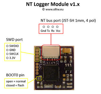 The NT v2.x modules can have a 4 pin JST-SH plug for the NT bus connector, and a 6-pin JST-SH header for the NT-X bus, with the pin assignments as shown below. The connections might also be exposed as solder pads. The modules in addition usually offer a BOOT0 solder jumper (the bootloader listens on the NT bus (UART1) pins), and some expose the SWD pins, to allow for a first-time flashing. Some modules offer some further solder jumper for configuring them, and some may provide access to additional extension pins.
