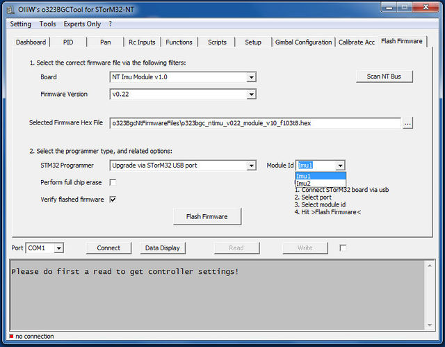 3. Choose the NT module in the [Board] combo box. Select the firmware via the [Firmware Version] field, or via the [Selected Firmware Hex File] text field. Select "Upgrade via STorM32 USB port" in the [STM32 Programmer] field. Importantly, choose which NT module shall be upgraded in the field [Module Id].