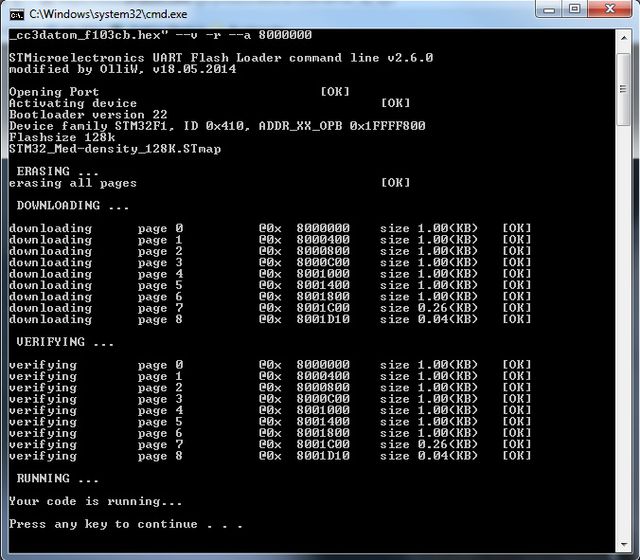 6. Now a black window (DOS console) should open and run the flash loader program. Wait until it is finished (takes some seconds).