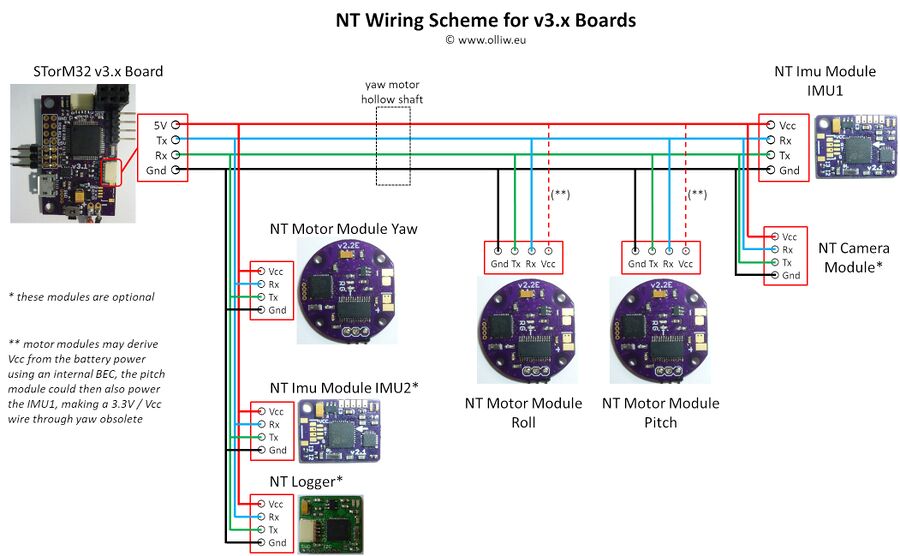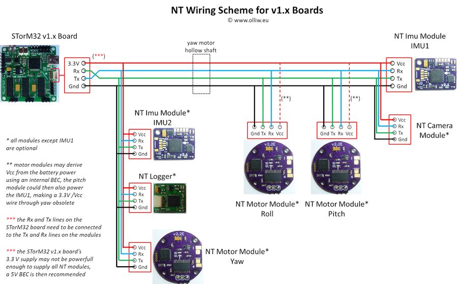 The schemes below show, for the v3.x/v4.x/v6.x and the v1.3x STorM32 boards, what could be a typical, fully NT-ized configuration.