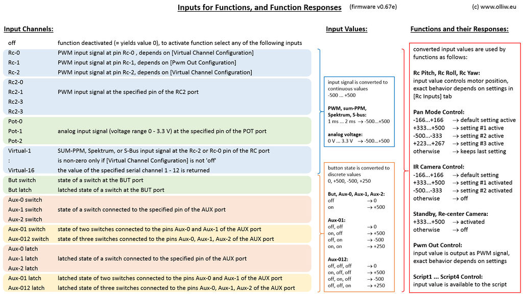 The STorM32 controller supports a rich set of different signal sources, such as PWM, sum-PPM, Spektrum or S-Bus, analog signals, and buttons and combination of buttons. Any possible input data stream is called an input channel (in firmware v0.67e there are 38 input channels). The value range is -500 ... +500, which implies that the original data of the input source is converted such as to fit into this [-500,+500] range. By default every input channels yields a value of 0, unless it is explicitly activated by attaching it to any of the functions in the GUI.