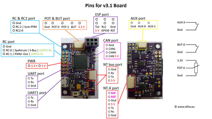 The STorM32 connections are grouped into ports. A port consists typically of one or more pins, a Gnd pin and possibly a 3.3 V or 5 V pin. The pins of a port are labeled by the port name plus a number (e.g. AUX-0 refers to the pin 0 on the AUX port) or by its commonly known function (such as Gnd, 3.3 V, Tx, Rx, SCL, SDA etc.). Some pins can serve multiple purposes, e.g., pin RC-0 serves also as Futaba S-BUS input or, on the v1.x boards, UART1-Rx.