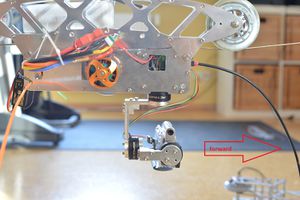 4. Now you are asked to pitch the frame, the entire copter, by 45° downward, as if the goal would film the ground in front of the copter. So you lift the frame accordingly and both, frame and camera should point downwards. To be more precise, the camera should not move relative to the frame. If it does you should consider balancing the camera better. Anyway, the entire goal in this task is to get a clear reading of which axis of each IMU are all impacted by this 45° degree movement. The IMU does measure the accelarion values, as we are static its only acceleration is the earth gravity. For example the reading in the forward position might be x/y/z=0g/1g/0g. When pitching downward, the value could change to 0.7g/0.7g/0g and therefore we know that the pitch axis is along the z axis, its reading did not change (much). This plus the +/- sign allows to derive the IMU orientation by simply measuring it.