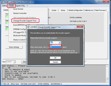 - Start the terminal and connect it to the STorM32 board. Power up the NT motor module with a battery.