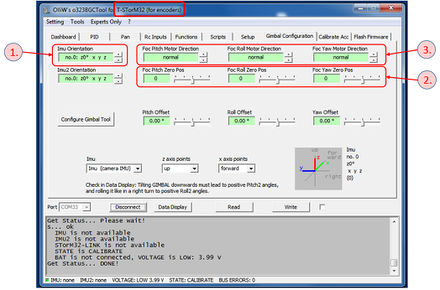 With all three NT motor modules configured, and the gimbal fully assembled, the basic configuration can be completed. These steps can be conveniently done using the GUI. Three parameter sets need to be determined, the orientation of the camera IMU (IMU1), the zero position of the encoders for each axis, and the motor spin direction for each axis. The corresponding parameter fields are located on the [GUI:Gimbal Configuration] tab.