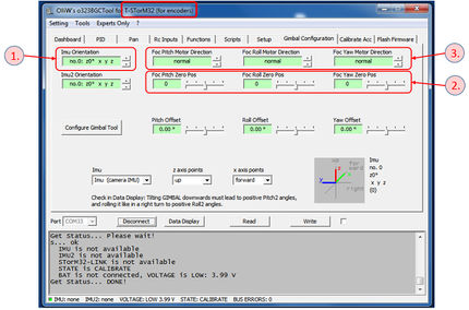 Three types of parameters need to be determined, the orientation of the camera IMU (IMU1), the zero position of the encoders for each axis, and the motor spin direction for each axis. The corresponding parameter fields are located on the [GUI:Gimbal Configuration] tab, see the figure.