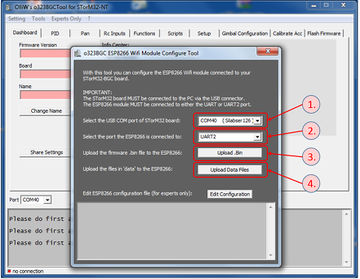 In the following steps you will flash the ESP8266 module with the dedicated firmware, upload some data files to the ESP8266 module, connect the ESP8266 module to the STorM32 controller, and configure the ESP support in the GUI.