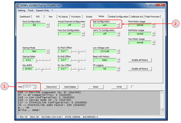 - Configuring the ESP support in the GUI: Connect the STorM32 board via one of the serial ports to your PC, select the correct port in the [Port] field, and hit [Connect] (do not use the Wifi connection, but a standard serial connection). Then browse to the [GUI:Setup] tab, and set the parameter Esp Configuration to “uart”. Write+Store the settings to the board, and repower. You must repower both the STorM32 and ESP boards; resetting only the STorM32 board is not sufficient.