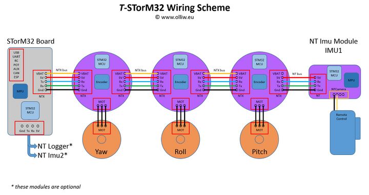 The concept thus consists of a main STorM32 controller board and NT Motor-Encoder modules, one for each axis. The motor drivers on the v4.1 STorM32 main board cannot be used for T-STorM32, and it is also not possible to connect encoders directly to the STorM32 main board. The NT Motor-Encoder modules are connected to the NT bus, and also to battery power. Thus, the NTX bus has been introduced, which carries both the NT bus signals and the battery power lines.